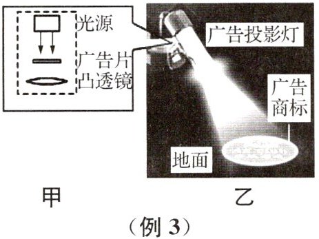 例3 (2024泰州靖江模拟)商场中经常看到的广告投影灯,其内部结构如图甲所示,镜头焦距为$20\ cm$,广告片到镜头的距离应在