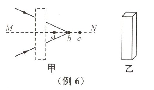 例6 (2025苏州昆山开发区四校联考)如图甲所示,一束光原来聚于主光轴MN上的b点,在虚线框内放入一透镜后,光线将会聚于主光轴MN上的c点,则该透镜是