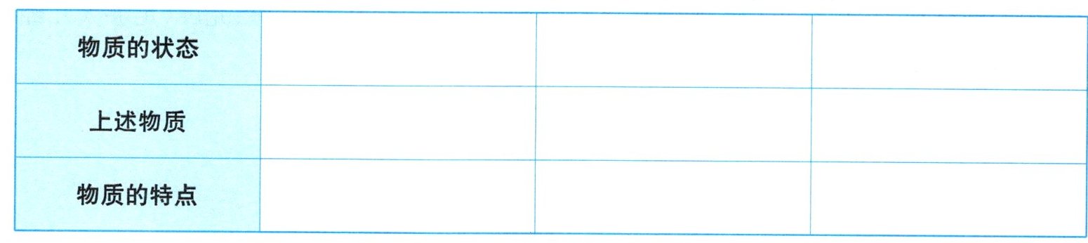 |物质的特点|有固定的体积和形状|有固定的体积,没有固定的形状|没有固定的体积和形态|