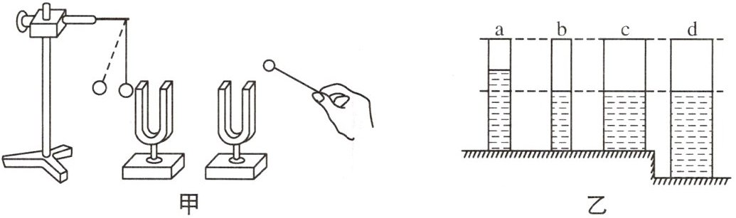 实验二:如图乙所示,有4支相同材料、相同厚度的玻璃量筒,其中a、b、c等高,a、b粗细相同,c、d粗细相同.各量筒内装有水,某同学猜想气柱发声的音调可能与:①气柱的长短有关;②气柱的横截面积有关.