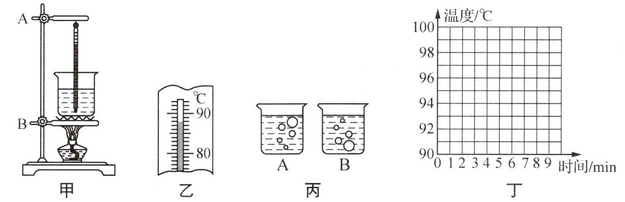 (4) 小明观察到:沸腾时水中气泡的情形为图丙中________(填“A”或“B”)图;沸腾时持续加热并继续测温,会发现________.
