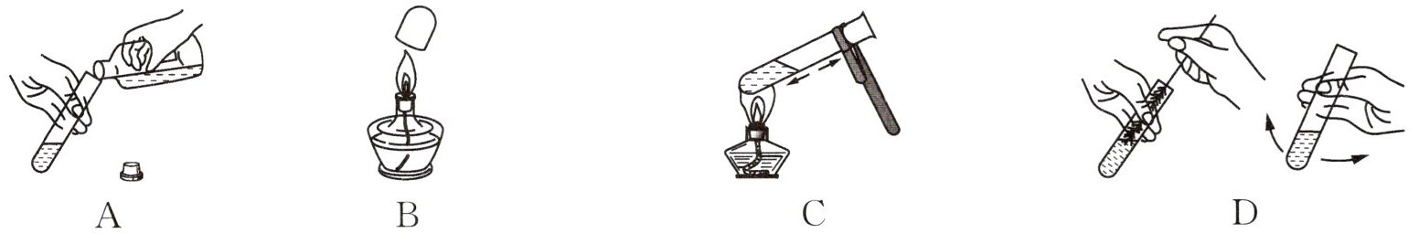 ,然后用酒精灯的外焰对准药品所在部位加热。(4) 如图D所示,如果试管内壁附有不易洗掉的物质时,清洗试管一般先用试管刷蘸去污粉
