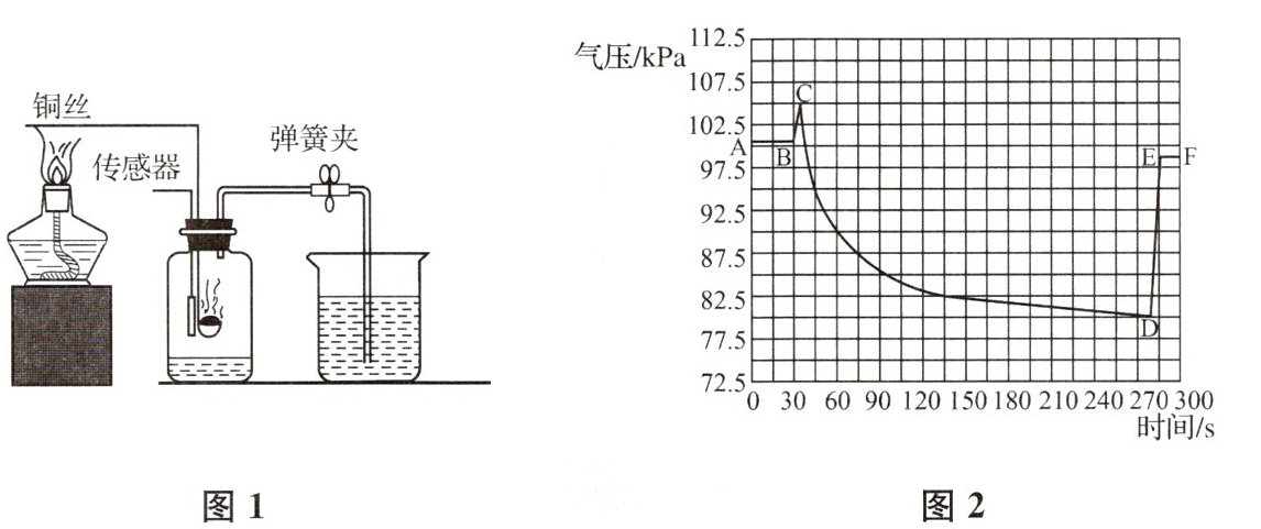 11. 某化学研究小组在学习了“空气中氧气含量的测定”实验的基础上,对教材中的实验装置进行了改进,设计出如图1所示的实验装置,实验时在粗铜丝末端的燃烧匙中放足量白磷(燃烧与红磷相似,生成五氧化二磷)。图2为用气体压力传感器测得的广口瓶中气压变化情况。请回答下列有关问题。