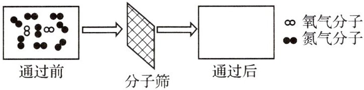 (2) 为满足生产生活对氧气的需求,市场上出现多种类型制氧机。分子筛制氧机以空气为原料,空气经过分子筛时氮气被吸附,氧气通过,获得高浓度的氧气。其微观示意图如下,请在方框中画出空气通过后的微粒图示。