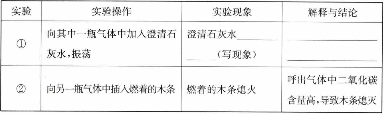 |②|向另一瓶气体中插入燃着的木条|燃着的木条熄火|呼出气体中二氧化碳含量高,导致木条熄灭|