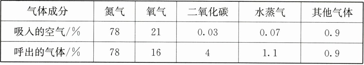 |呼出的气体/%|78|16|4|1.1|0.9|