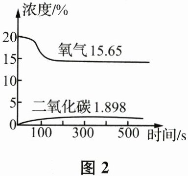 Ⅱ. 进行如图1所示实验,用氧气、二氧化碳传感器在烧杯顶部测量杯内两支蜡烛从点燃到全部熄灭后,杯内氧气和二氧化碳的浓度变化如图2所示。