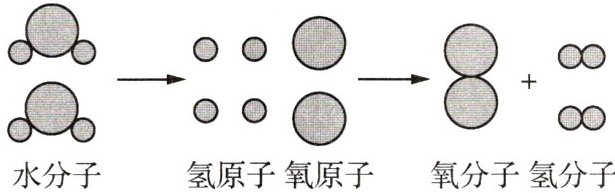 每个水分子分解成 2 个氢原子和 1 个氧原子,2 个氢原子结合成 1 个氢分子,2 个氧原子结合成 1 个氧分子