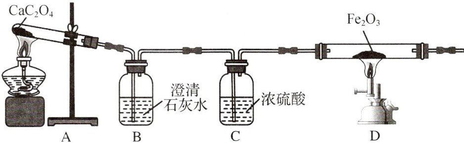 ,写出在D中发生反应的化学方程式$Fe_{2}O_{3} + 3CO\xlongequal{高温}2Fe + 3CO_{2}$