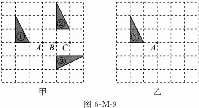 (填“A”或“B”或“C”);(3)在图乙中画出三角形①绕点A顺时针旋转$90^{\circ}$后得到的图形.