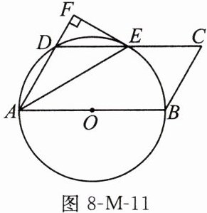 14. (17 分)如图 8-M-11,四边形 ABCD 是平行四边形,以 AB 为直径的$\odot O$经过点 D,与 DC 交于点 E,连接 AE,$∠EAB=∠EAD$.过点 E 作$EF⊥AD$,与 AD 的延长线交于点 F.