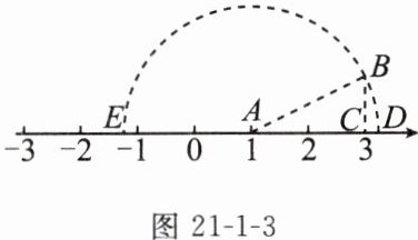 15. 核心素养 抽象能力 如图 21-1-3,在数轴上,点$A$与点$C$表示的数分别为 1 和 3,明明同学以点$C$为直角顶点作$Rt\triangle ABC$,其中$BC=1$,再以点$A$为圆心,$AB$为半径画弧,交数轴于$D$,$E$两点.莲莲说:“若点$D$,$E$表示的数分别为$m$和$n$,我发现$m$是一元二次方程$x^{2}+bx-4=0$的一个根.”琮琮说:“$n$一定不是此方程的根.”