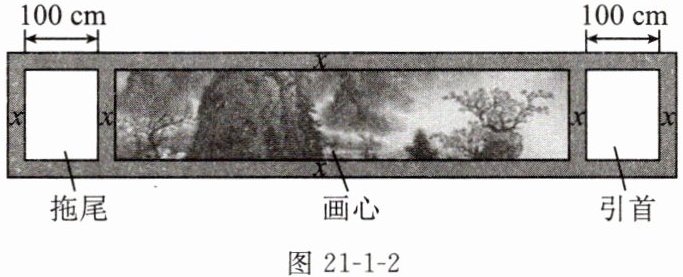 (2)手卷是国画装裱中横幅的一种体式,以能握在手中顺序展开阅览得名,它主要由“引首”“画心”“拖尾”三部分组成(这三部分都是矩形形状),分隔这三部分的其余部分统称为“隔水”.如图 21-1-2 中的手卷长 1000 cm,宽 40 cm.引首和拖尾完全相同,其宽度都为 100 cm.设隔水的宽度为$x$ cm,若画心的面积为$15200cm^{2}$,则隔水的宽度为多少厘米?