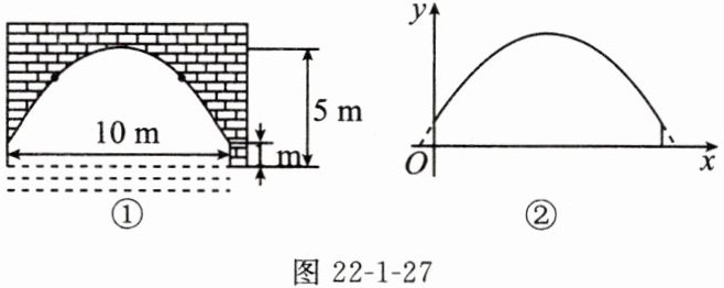 14. 一座拱桥的截面图如图22-1-27①所示,拱桥桥洞上沿是抛物线形状,抛物线两端点与水面的距离都是1m,拱桥的跨度为10m,拱顶与水面的最大距离是5m,桥洞两侧壁上各有一盏距离水面4m的景观灯。在平面直角坐标系中,拱桥的截面示意图如图②所示。