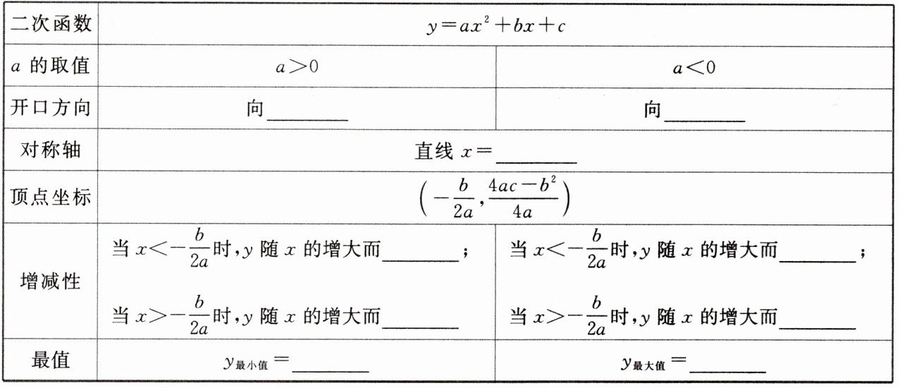 上 下 -$\frac{b}{2a}$ 减小 增大 增大 减小 $\frac{4ac-b^{2}}{4a}$ $\frac{4ac-b^{2}}{4a}$