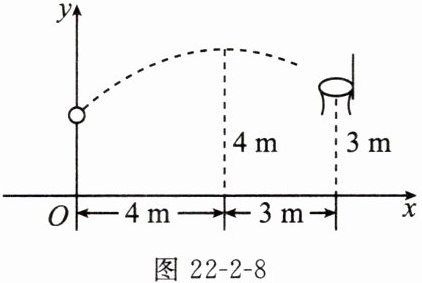 15. 某校九年级的一场篮球比赛中,队员甲正在投篮,已知球出手时离地面高$\frac{20}{9}m$,当球出手后水平距离为4m时到达最大高度4m,设篮球运行的轨迹为抛物线,建立如图22-2-8所示的平面直角坐标系。