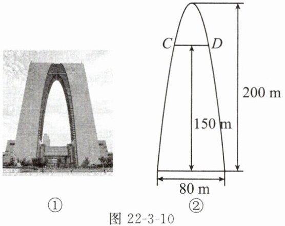 3. 如图22-3-10①,“东方之门”通过简单的几何曲线处理,将传统文化与现代建筑融为一体,最大程度地传承了苏州的历史文化.如图②,“门”的内侧曲线呈抛物线形,已知其底部宽度为80m,高度为200m.求离地面150m处的水平宽度(即CD的长)为多少米.