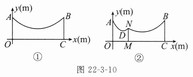 6. 如图22-3-10①,AO,BC是两根垂直于地面的立柱,且长度相等.在两根立柱之间悬挂着一根绳子,建立坐标系,绳子形如抛物线$y=\frac {1}{10}x^{2}-x+4$.因实际需要,在OA与BC间用一根高为2.5m的立柱MN将绳子撑起(如图②),若立柱MN到OA的水平距离为3m,MN左侧抛物线的最低点D与MN的水平距离为1m,则点D到地面的距离为______