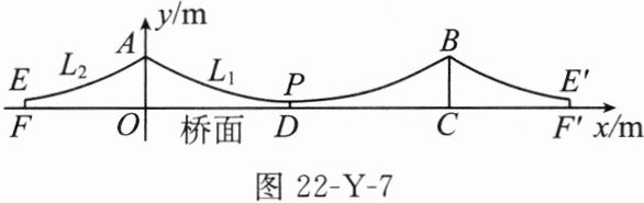 13. (2024 陕西)一条河上横跨着一座宏伟壮观的悬索桥.桥梁的缆索 $ L_1 $ 与缆索 $ L_2 $ 均呈抛物线形,桥塔 $ AO $ 与桥塔 $ BC $ 均垂直于桥面,如图 22-Y-7 所示,以 $ O $ 为原点,以直线 $ FF' $ 为 $ x $ 轴,以桥塔 $ AO $ 所在直线为 $ y $ 轴,建立平面直角坐标系.