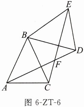 6. 如图6-ZT-6,在$\triangle ABC$中,$BA=BC,∠ABC=50^{\circ }$,将$\triangle ABC$绕点B按逆时针方向旋转$100^{\circ }$,得到$\triangle DBE$,连接AD,CE交于点F.