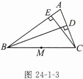 变式 已知:如图24-1-3,BD,CE是$\triangle ABC$的高,M为BC的中点。求证:点B,C,D,E在以点M为圆心的同一个圆上。