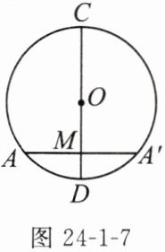2. (1)如图24-1-7,若直径CD与弦AA'相交于点M,且CD平分AA',弦AA'不过圆心O,则CD垂直于AA'吗?图中还有哪些劣弧相等?