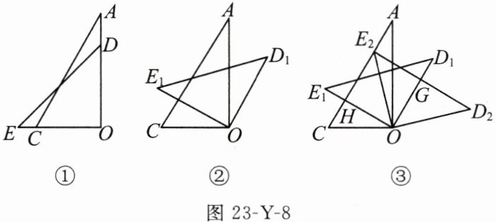 9. (2023德阳)将一副三角尺DOE与AOC叠放在一起,如图23-Y-8①,$∠O=90^{\circ },∠A=30^{\circ },∠E=45^{\circ },OD>OC$.将三角尺DOE绕点O顺时针旋转$\alpha (0^{\circ }<\alpha <90^{\circ })$到$\triangle D_{1}OE_{1}$的位置,使$OD_{1}// AC$,如图②.