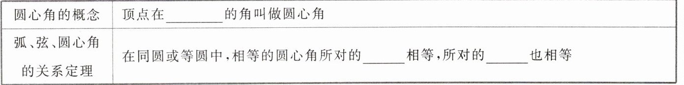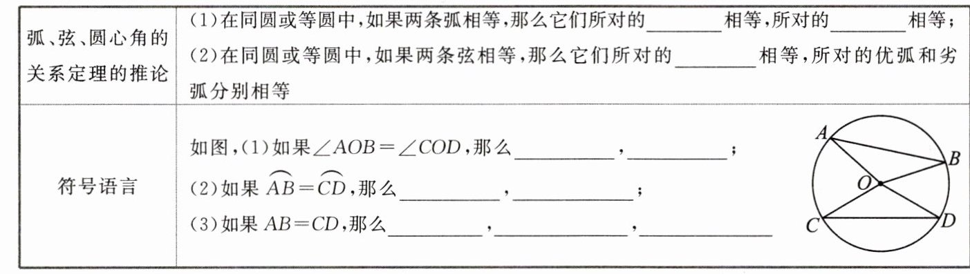 圆心;弧;弦;圆心角;弦;圆心角;$\overset{\frown}{AB}=\overset{\frown}{CD}$;$AB = CD$;$\angle AOB=\angle COD$;$AB = CD$;$\angle AOB=\angle COD$;$\overset{\frown}{AB}=\overset{\frown}{CD}$;$\overset{\frown}{ACB}=\overset{\frown}{CBD}$(优弧答案不唯一)