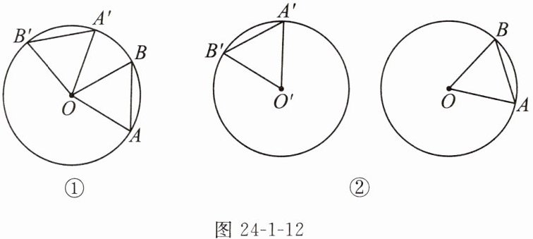 (1)如图24-1-12①,在⊙O中,当圆心角∠AOB=∠A'OB'时,它们所对的弧$\overset{\frown}{AB}$和$\overset{\frown}{A'B'}$、弦AB和A'B'相等吗?为什么?