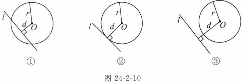 如图24-2-10,设⊙O的半径为r,圆心O到直线l的距离为d。在直线和圆的不同位置关系中,d与r具有怎样的大小关系?反过来,你能根据d与r的大小关系确定直线和圆的位置关系吗?