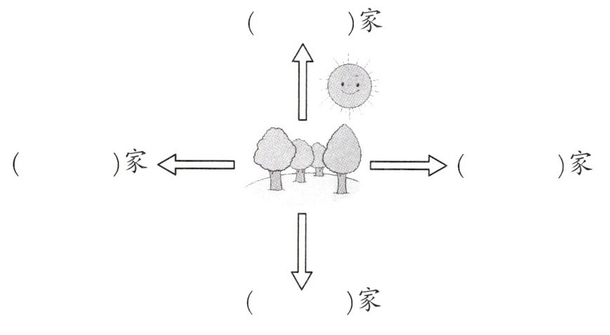 小美、小军、小红和小明四人在森林里迷路了,他们迎着太阳走,这时太阳下山了。小美家的西面是森林。小明家在森林的西面。小军说:“我家在森林的北面。”小红说:“我家在小军家对面。”你能帮他们找到各自的家吗?