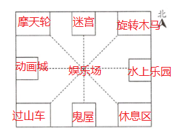 1. 娱乐城在中心,西面是动画城,东面是水上乐园,北面是迷宫。