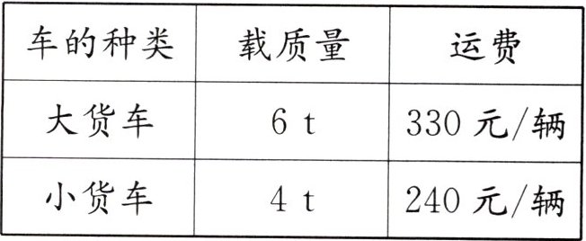 解:因为大货车每吨运费$330÷6 = 55$(元$/t$),小货车每吨运费$240÷4 = 60$(元$/t$),$55\lt60$,所以优先用大货车。$32÷6 = 5$(辆)$\cdots\cdots2$($t$),若用$5$辆大货车$1$辆小货车,运费$5×330 + 240=1890$元;若用$4$辆大货车,$(32 - 4×6)÷4 = 2$辆小货车,运费$4×330+2×240=1320 + 480 = 1800$元。$1800\lt1890$。