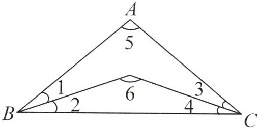 五、如下图,已知三角形ABC是等腰三角形,$ \angle 1 = \angle 2 $,$ \angle 3 = \angle 4 $,$ \angle 5 = 100 ^ { \circ } $,求$ \angle 6 $的度数。