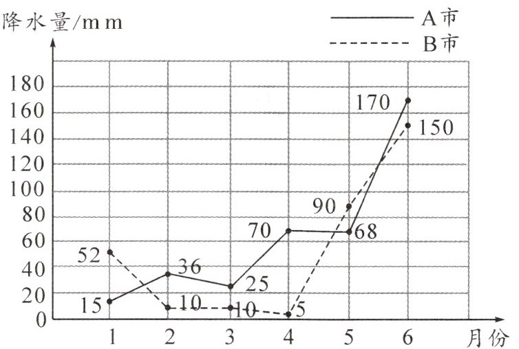 ①A 市 1 月份的降水量最少,6 月份的降水量最多;②B 市 4 月份的降水量最少,6 月份的降水量最多。