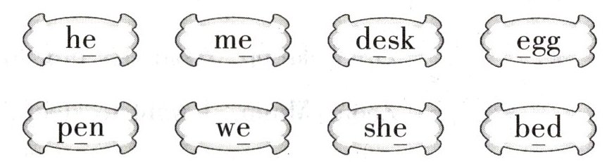 1. he me we she 2. desk egg pen bed