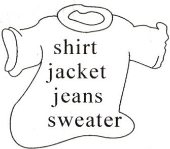 Clothes for warm days: shirt, T - shirt, skirt, dress;Clothes for cool days: jacket, sweater, jeans, pants
