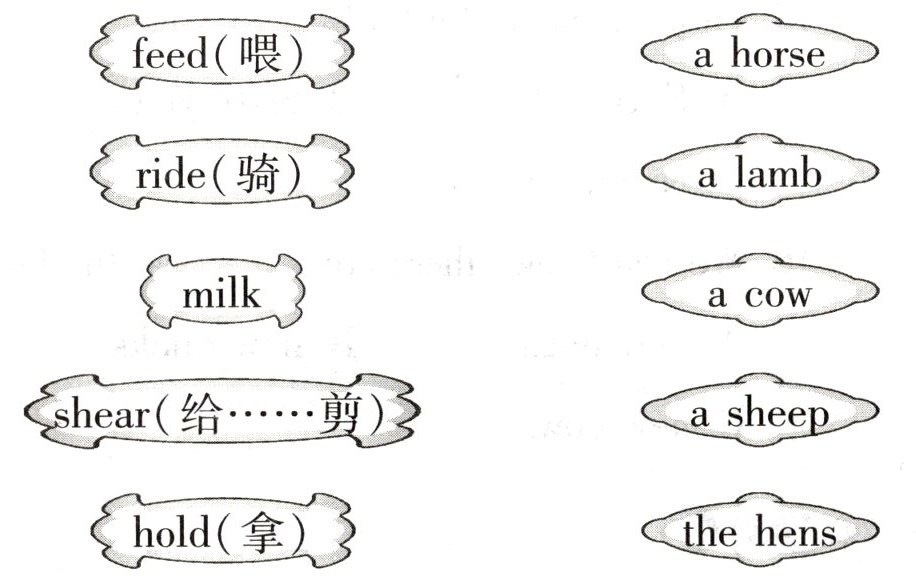 $\begin{array}{ll}\text{feed(喂)}& \text{a horse} \\ \text{ride(骑)}& \text{a lamb} \\ \text{milk}& \text{a cow} \\ \text{shear(给……剪)}& \text{a sheep} \\ \text{hold(拿)}& \text{the hens}\end{array}$