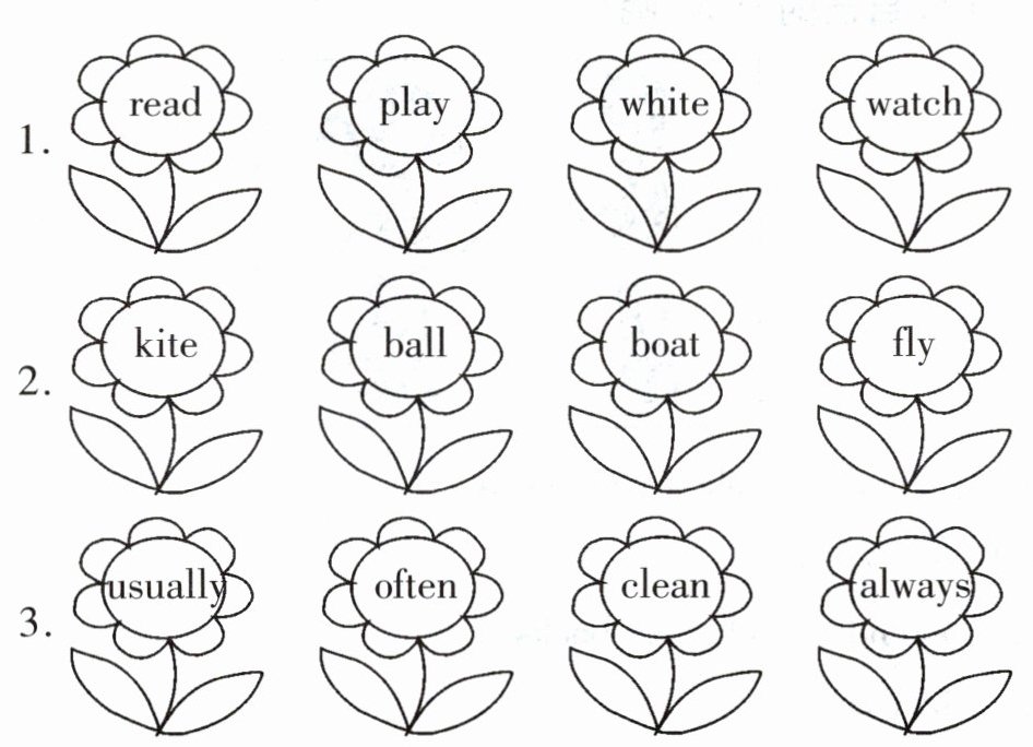 3 (★)请找出下列每组单词中不同类的一个,将花朵涂成红色。