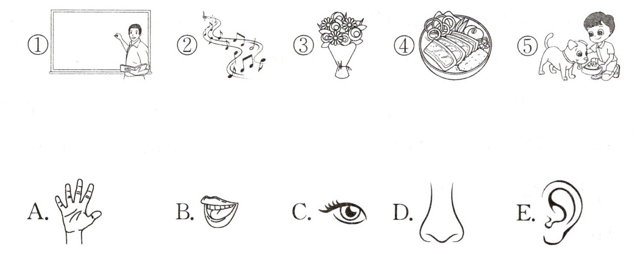 ①____ I see teachers in class with my eyes. I hear songs in the music(音乐) class with my ears. I recognize(辨别出) different smells of flowers with my nose. I taste food(食物) in the canteen(食堂) with my tongue. I touch my dog with my hand. This shows my kindness(友好).