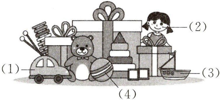 丹丹有一些玩具,请帮她给这些玩具贴上标签吧。选词填空,把答案填在横线上。