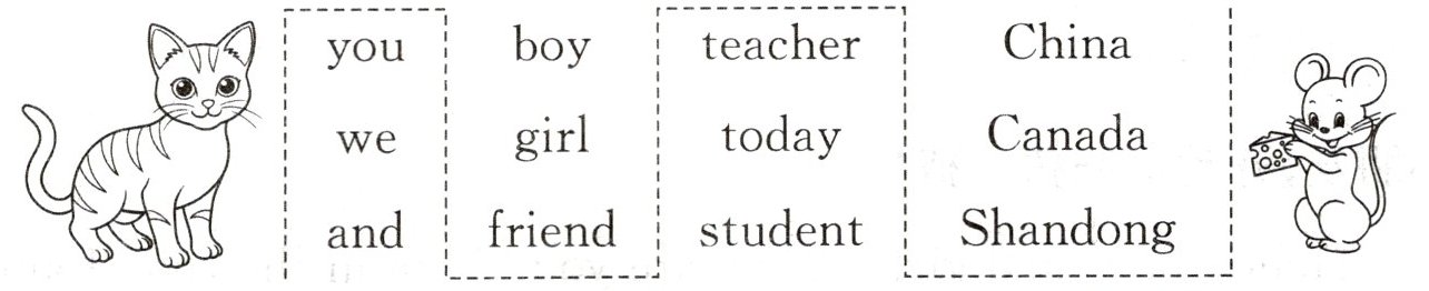 早饭后,文文和新交的朋友一起玩游戏。请圈出每组单词中与其他单词不同类的一项,帮助小猫抓到老鼠。