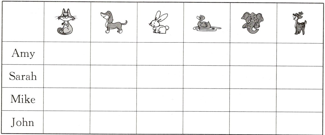 Amy, Sarah, Mike and John are best friends. They all like animals. Sarah likes rabbits very much, but Amy doesn't. She likes cats best. John likes dogs best. Mike likes dogs, too. But Mike likes ducks best.