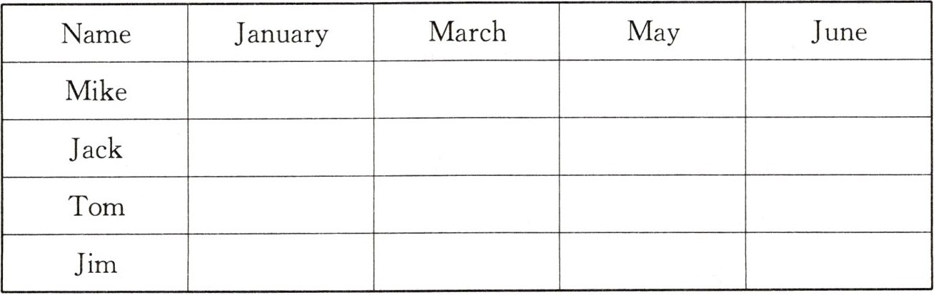 Mike在March打√;Jack在May打√;Tom在May打√;Jim在January打√。