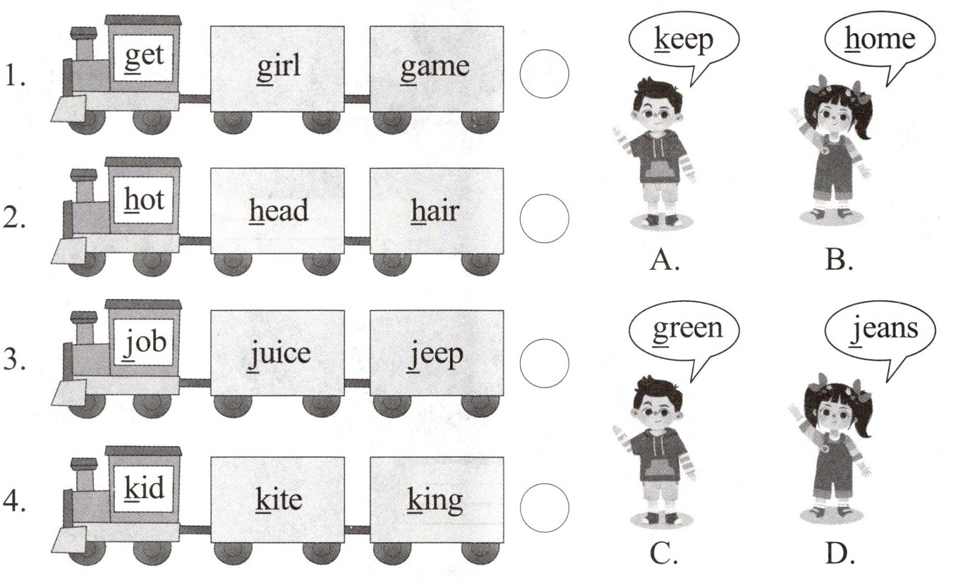 读单词,找出与画线部分发音相同的单词,将其字母序号写在圆圈内。