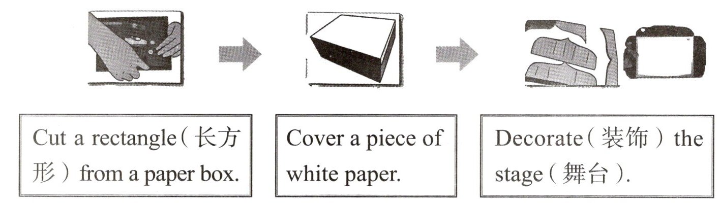 读说明书,制作皮影戏玩偶和舞台,并根据提示进行配音表演。