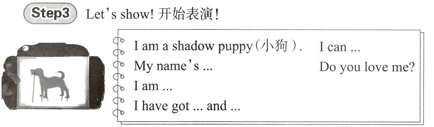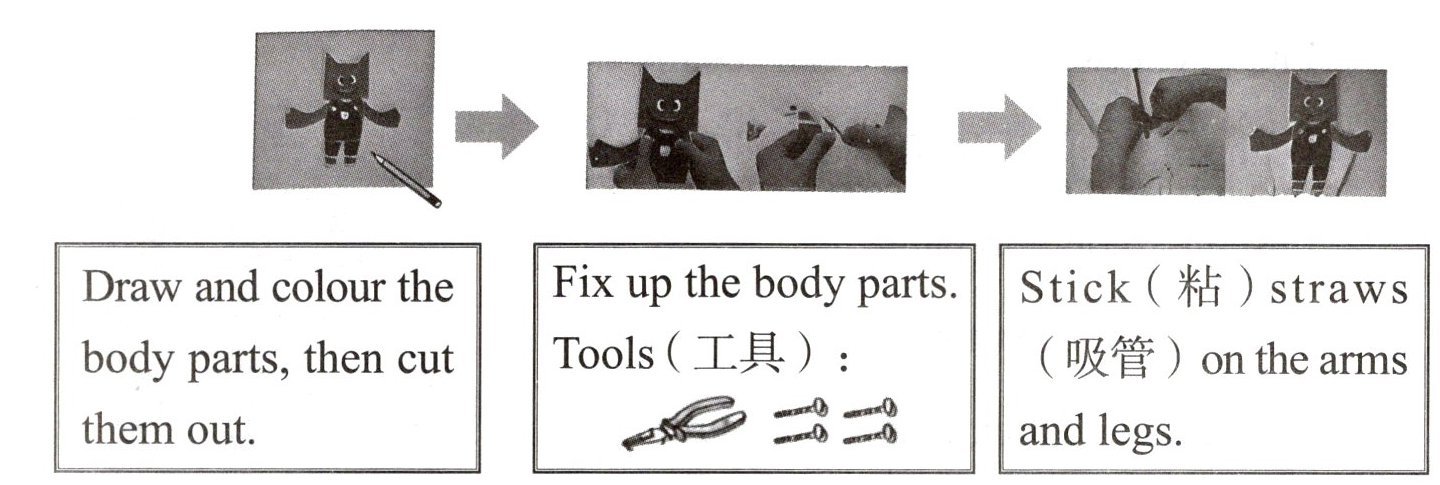 按照Step1的步骤,先画出并给皮影戏偶的身体部分上色,然后剪下来;接着用工具(钳子等)固定身体部分;再在胳膊和腿上粘上吸管。按照Step2的步骤,从纸盒上剪下一个长方形,覆盖一张白纸,装饰舞台。最后按照Step3的提示进行配音表演,比如:I am a shadow puppy. My name's Puppy. I am cute. I have got big eyes and a short tail. I can run and jump. Do you love me? (答案不唯一,可根据自己制作的皮影戏偶进行创作)。