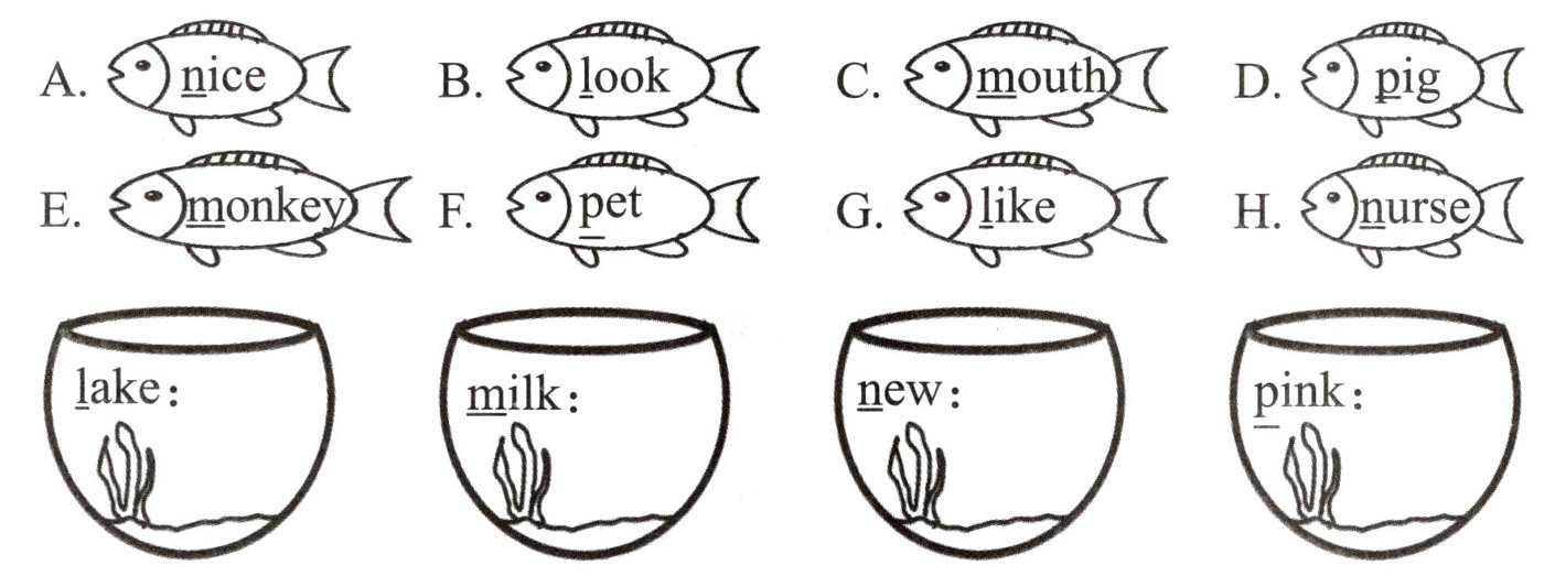 读单词,找出与鱼缸里的例词画线部分发音相同的单词,将其字母序号写在鱼缸里。