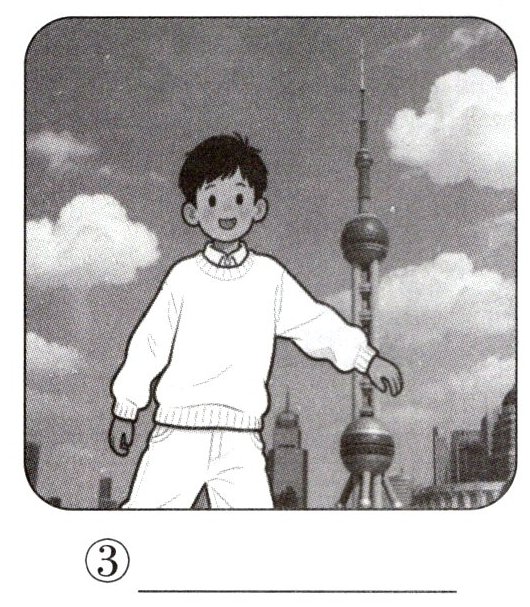 读短文,在横线上写出小朋友的名字,并将他们的衣服涂上颜色。