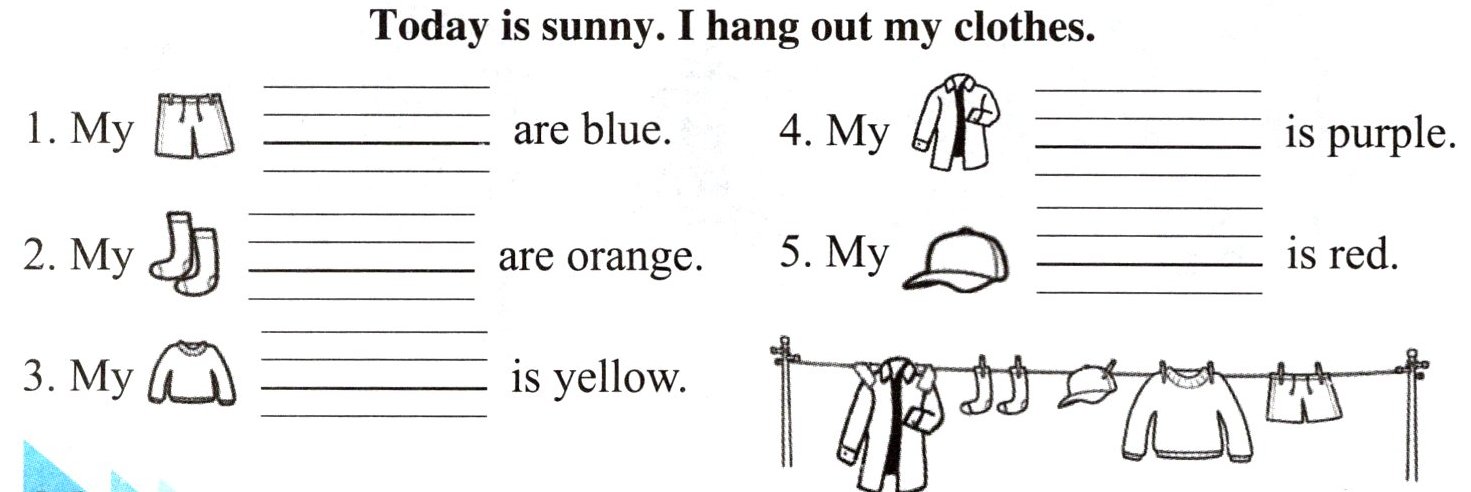 看图片,在四线格内写出对应的服装单词,并根据内容给晾晒的衣服涂色。